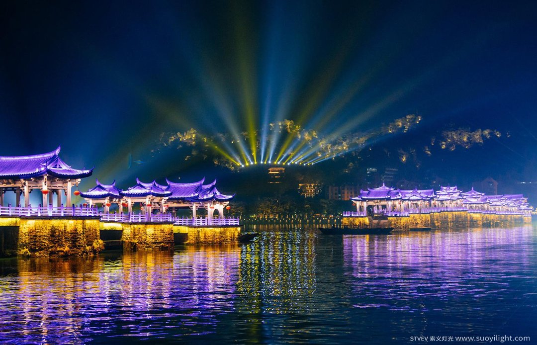 为了凸显古亭的特有建筑风格,实现色彩丰富的灯光效果,整座桥体安装了1万多套RGBW系列,单点单控的LED瓦楞灯、LED投光灯、LED洗墙灯,为光影秀的创作提供了更多的可塑性。